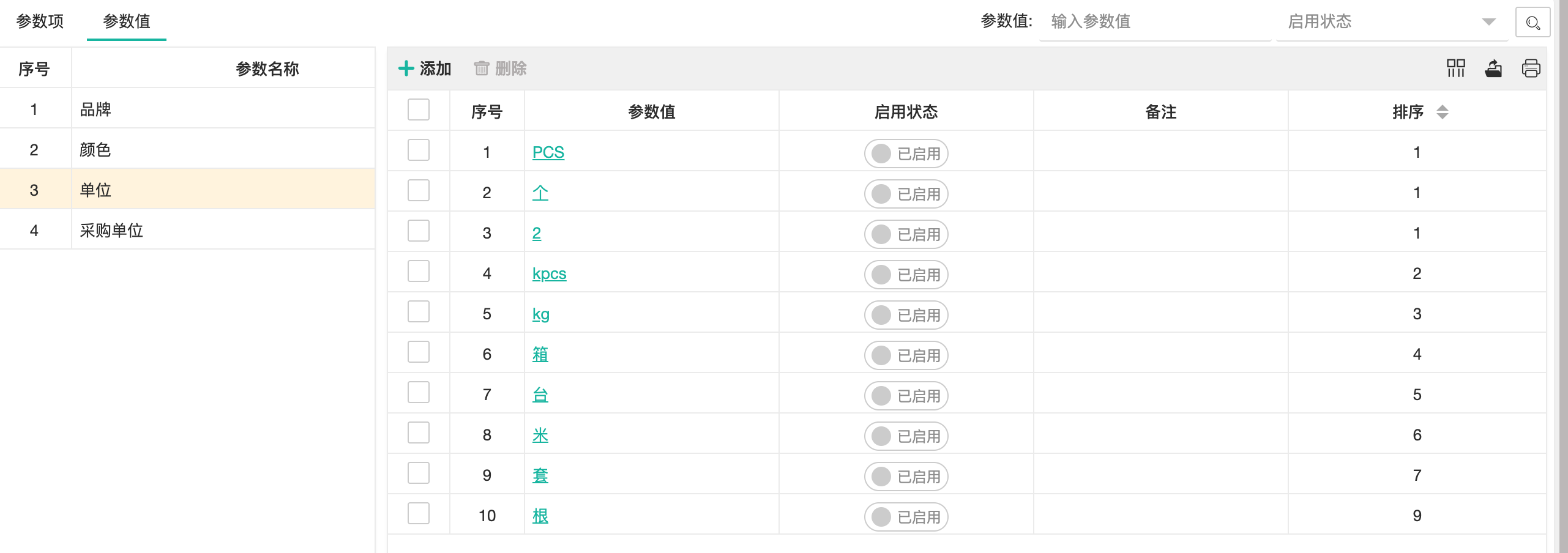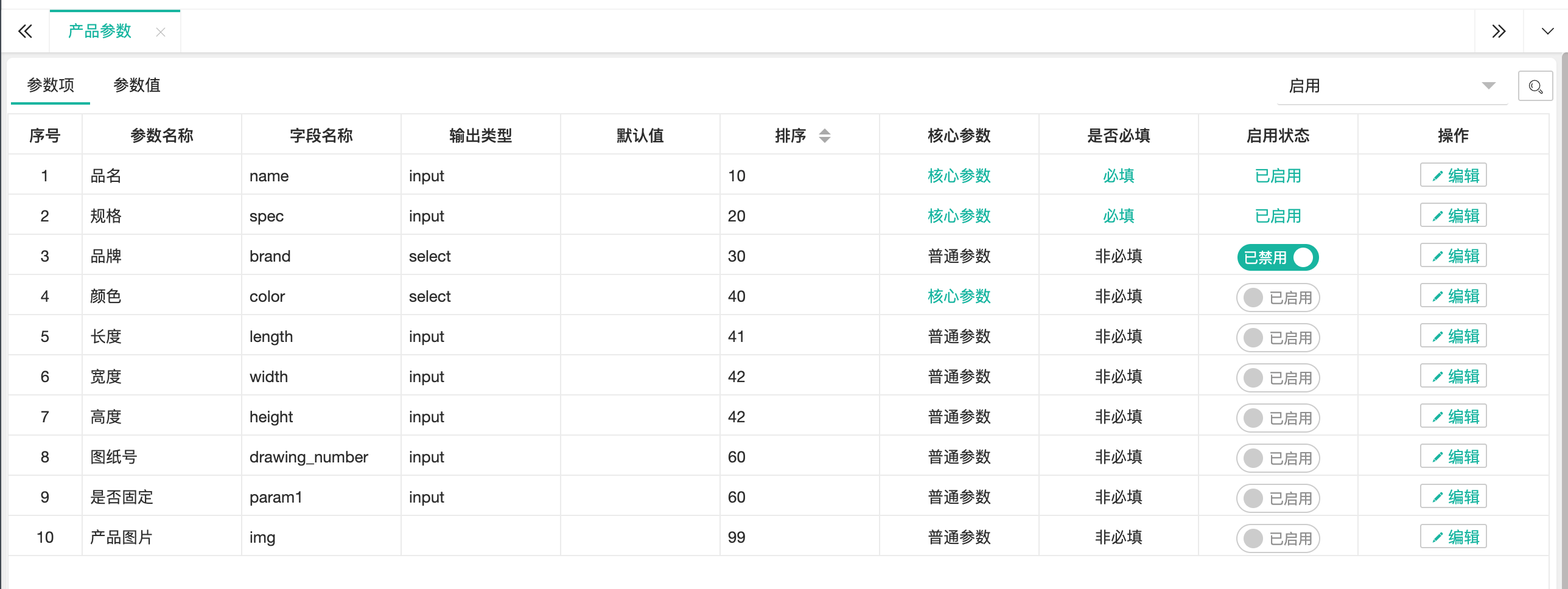 【产品参数】设置产品启用和禁止参数项和下拉参数的参数值;产品分类可选择的参数也是在这里设置启用后才可使用。  ## ● 参数项 【参数项】指产品档案中基础信息的参数字段。目前有35个参数字段支持用户自定义修改使用。 ### ● 启用/禁用 操作步骤 1. 进入【产品管理】>【产品档案】>【产品参数】>【参数项】,列表默认展示启用中参数; 2. 单击“启动状态”列可设置禁用; 3. 单击工具条右上角“状态查询”条件,切换到“所有状态”或“禁用”状态,单击【查询】按钮查询,可将禁用参数设置为启用。 ### ● 编辑参数项 操作步骤 1. 进入【产品管理】>【产品档案】>【产品参数】>【参数项】; 2. 单击列表中“操作”列中【编辑】按钮; 3. 系统弹出【*编辑参数项*】窗口,设置参数显示名称、输出方式、是否关键字、是否必填、业务单据中是否展示等信息。 > **部分设置属性说明** > | 属性 | 说明 | > | --- | --- | > | 输出类型-下拉列表 | 产品档案中该字段使用下拉选择输入值。选项值在【产品参数】>【参数值】中维护。 | > | 输出类型- 计算参数 | 设定为计算参数后可以写计算规则,如param1+param2,那这个参数在新增产品档案时就不能输入,需要根据param1和param2自动完成计算 | > | 关键参数 | 设置为关键参数后,所有产品档案中不允许此参数的值相同。当存在相同值时产品将无法进行保存。 | > | 是否必填 | 设置产品新增时校验是否必填属性。 | > | 审核后编辑 | 产品档案审核通过后是否允许编辑。 | > | 允许批量更新 | 此参数字段在产品列表上是否允许批量更新操作 | > ## ● 参数值 产品参数是下拉属性时,参数值需在此页签中进行维护。否则产品新增/编辑时没有选项值。
