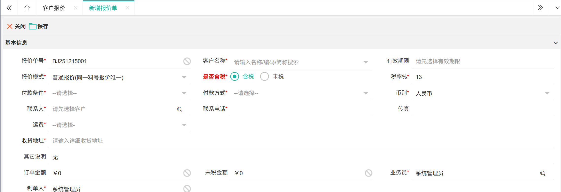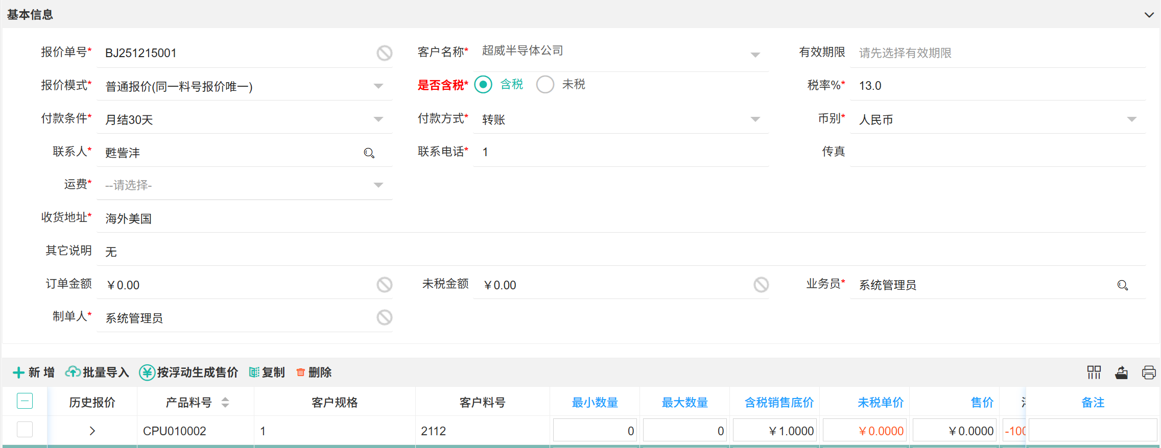 【客户报价】客户对要购买产品进行报价,用于向客户提供产品 / 服务的价格方案。  ## ● 报价单 ### ● 新增报价单 1. 进入【销售管理】>【售前管理】>【客户报价】; 2. 在列表上方单击【+新增】按钮; 3. 在弹出报价单页面,选择【客户名称】; 4. 填写完基本信息后,单击产品上面的【新增】; 5. 根据左侧分类和顶部查询条件,查找产品进行勾选; 6. 确认所有产品后单击【选择】; 7. 在报价单下方补充产品信息,完成后【保存】; 8. 【提交】并【审核】后,新增成功。  > 报价属性部分字段说明 > | 字段 | 说明 | | --- | --- | | 有效期限 | 产品报价的有效期限 | | 报价模式 | 普通报价:同一料号产品报价数量固定、价格固定;阶梯报价:同一料号产品通过购买数量进行阶梯报价,不同数量区间价格不同 | | 是否含税 | 含税:包含产品价格和税价,可直接支付;未税:仅包含产品本身价格,另外支付税价 | | 运费 | 含运费:产品报价的运费一并承包;垫付:由我司代付运费送到后还款;到付:产品送到后付清运费 | >d **附注** >1:选择【客户名称】会自动根据客户档案补充基本信息。 >2:报价模式配置可在【系统管理】>【系统配置】>【配置项】调整。 ### ● 批量导入 1. 进入【销售管理】>【售前管理】>【客户报价】; 2. 在列表上方单击【导入】按钮,选择【模板下载】; 3. 根据模板填写后,上传文件,单击【确定导入】。  ### ● 售价浮动 1. 进入【销售管理】>【售前管理】>【客户报价】; 2. 列表单击【*报价单号*】; 3. 在报价详情勾选已添加的产品,单击【按浮动生成售价】; 4. 输入浮动百分比,点击【确定】。 >d **附注** >1:只有未提交时才能生成浮动售价,提交后售价固定。 ### ● 删除报价单 1. 进入【销售管理】>【售前管理】>【客户报价】; 2. 根据左侧分类和客户名称筛选,勾选后单击【删除】。 >d **附注** >1:审核通过的询价单无法删除,要先进行反审核。 >2:不支持批量删除。 ### ● 报价单反审核 1. 进入【销售管理】>【售前管理】>【客户报价】; 2. 根据查询条件查找要反审核的单据,单击【报价单号】; 3. 在报价单详情页面,点击【反审核】; 4. 填写反审核原因后【确认】。 ### ● 报价单打印 1. 进入【销售管理】>【售前管理】>【客户报价】; 2. 根据查询条件查找需打印的单据,单击【报价单号】; 3. 报价单详情页面找到【打印】,在下拉列单击【销售报价单】; 4. 在弹出预览窗口单击【打印】按钮。 >d **附注** >1:只有审核通过的单据可以导出PDF或进行打印。 >2:如果需导出PDF也可在预览窗口单击【导出PDF】。 ### ● 报价单复制 1. 进入【销售管理】>【售前管理】>【客户报价】; 2. 根据查询条件查找想要复制的单据,单击【报价单号】; 3. 在报价单详情页面,单击【复制】并确认。 >d **附注** >1:只有审核通过的单据可以复制。 ### ● 报价单转订单 1. 进入【销售管理】>【售前管理】>【客户报价】; 2. 根据查询条件查找需要下单的客户,单击【转为订单】; 3. 补充基本信息和下单产品,单击【保存】。 >d **附注** >1:只有审核通过的报价单据可以转订单。 ### ● 报价单转合同 1. 进入【销售管理】>【售前管理】>【客户报价】; 2. 根据查询条件查找需要签合同的客户,单击【转为合同】; 3. 补充基本信息和交易产品,单击【保存】。 >d **附注** >1:只有审核通过的报价单据可以转合同。 ### ● 查看报价成本 1. 进入【销售管理】>【售前管理】>【客户报价】; 2. 根据查询条件查找想要确定成本的客户,单击【报价单号】; 3. 在报价详情单击产品上面的【查看成本】。  ## ● 报价明细 ### ● 查看核算详情 1. 进入【销售管理】>【售前管理】>【客户报价】>单击【报价明细】; 2. 根据左侧分类和客户名称筛选客户,单击【查看核算详情】; 3. 在弹出的核算详情页面,可查看产品料号的所有核算明细。 ### ● 导出报价明细 1. 进入【销售管理】>【售前管理】>【客户报价】>单击【报价明细】; 2. 根据左侧分类和客户名称筛选要导出的客户,单击【导出】。