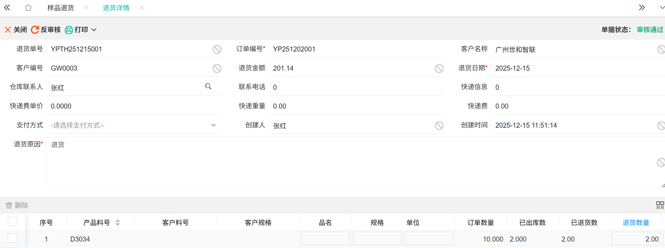 【样品退货】客户退回已出货/已成交样品的凭证。  ## ● 样品退货单 ### ● 新增样品退货单 1. 进入【销售管理】>【样品管理】>【样品退货】; 2. 在列表上方点击【+新增】; 3. 在弹出详情页面选择【*订单编号*】并补充信息; 4. 填写完成后【保存】并【提交】。 ### ● 删除样品退货单 1. 进入【销售管理】>【样品管理】>【样品退货】; 2. 通过退货单号筛选后,勾选单击【删除】。 >d **附注** >1:已审核通过的样品退货单无法删除需要先反审核。 >2:不支持批量删除。 ### ● 反审核退货单 1. 进入【销售管理】>【样品管理】>【样品退货】; 2. 通过退货单号筛选要反审核的单据,单击【*退货单号*】; 3. 在退货详情页面,单击【反审核】; 4. 填写原因后【确认】。 ### ● 打印退货单 1. 进入【销售管理】>【样品管理】>【样品退货】; 2. 通过退货单号查找,单击【*退货单号*】; 3. 在退货详情找到打印,下拉列选择【样品退货单】; 4. 在弹出预览窗口单击【打印】按钮。 >d **附注** >1:只有审核通过的单据可以导出PDF或进行打印。 >2:如果需导出PDF也可在预览窗口单击【导出PDF】。 ## ● 退货明细 记录了所有样品退货单,包括已删除的单据。