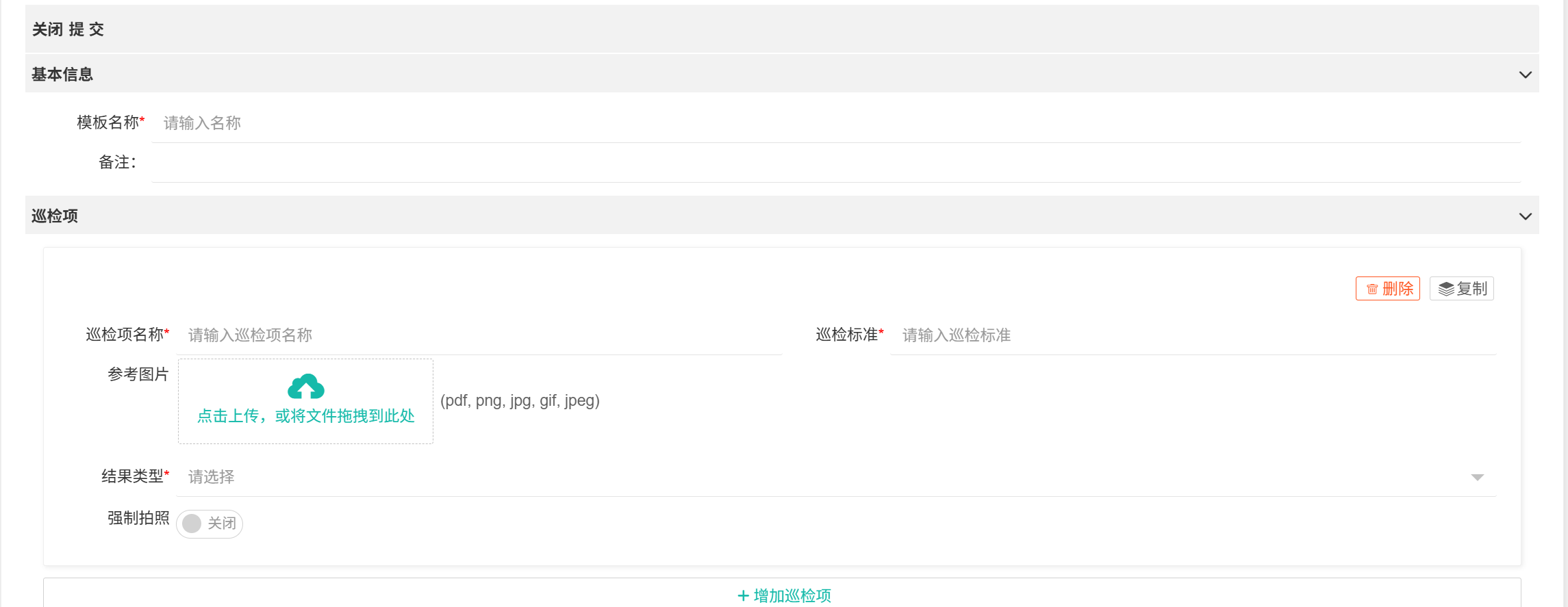 【巡检模板】巡检内容模板,提前设定好巡检内容。  ## ● 添加模板 1. 进入【设备管理】>【设备巡检】>【巡检模板】; 2. 点击列表上方【+添加】,在弹出页面设置好模板后单击【提交】。 ## ● 复制 1. 进入【设备管理】>【设备巡检】>【巡检模板】; 2. 选择要复制的模板,在列表操作栏单击【复制】。 >d **附注** >1:复制会将所选模板巡检项复制。 ## ● 删除 选中要删除的模板在列表操作栏单击【删除】。