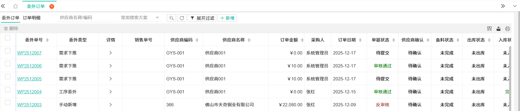 【委外订单】公司内部全部委外订单,包括需求下推、工序委外、手动新增。进入菜单默认展示全部数据,可根据供应商名称/编码进行搜索。  ### ● 委外订单——新增订单 授权用户可在【委外订单】中新增订单。 操作步骤: 1. 进入【委外加工】>【委外加工】>【委外订单】>【委外订单】; 2. 单击工具条上【+ 新增】弹出新增委外订单窗口; 3. 填写供应商名称、产品、数量、交货日期,完成后依次点击【保存】、【提交】。 >d **附注** >产品只能选择已审核通过、有BOM且未被禁用的产品,如无法搜索到产品信息,请在产品档案中确认产品是否处于”待提交/反审核/已禁用“状态。 ### ● 删除 操作步骤: 1. 进入【委外加工】>【委外加工】>【委外订单】; 2. 勾选委外订单,单击工具条上【删除】按钮。 ==1、订单不同来源,订单的执行不一样,要体现出标准委外订单和工序订单的不同。== ==2、委外订单价格模式体现 3、标准委外订单下推:包含物料出库、物理退货、成品入库、成品退货== ==4、标准委外订单在什么情况下才会走委外来料== ### ● 订单明细——下推 操作步骤: 1. 进入【委外加工】>【委外加工】>【委外订单】>【订单明细】; 2. 勾选单据,单击工具条上【下推】按钮。  ### ● 订单明细——结单 对业务单据进行最终的确认与关闭操作。