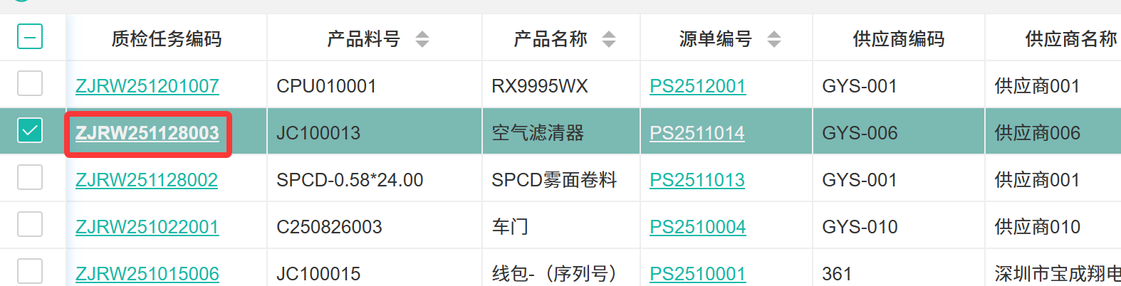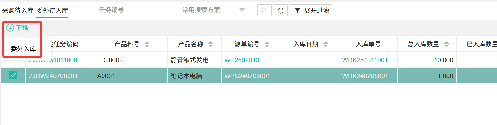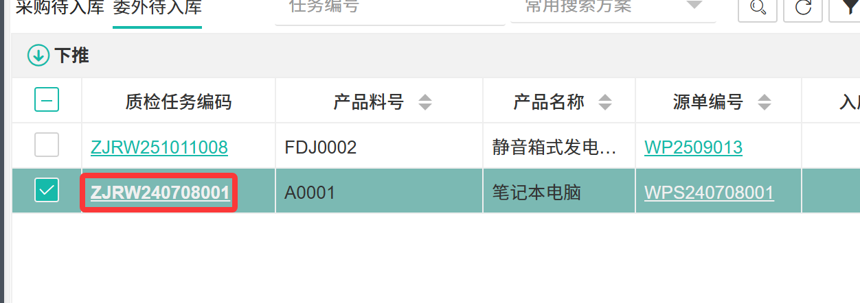 【质检待入库】物料已完成质量检验且结果为合格,但尚未办理正式入库手续。  ## ● 采购待入库 ### ● 采购待入库单下推 操作步骤: 1. 进入【品质管理】>【来料IQC】>【质检待入库】>【采购待入库】。 2. 选择需要下推入库的单据。 3. 单击【下推】按钮,接着在下拉框单击【采购入库单】。  > 采购待入库字段说明 >| 字段 | 说明 | | --- | --- | |质检任务编码 |检验任务的唯一编号。 | |产品料号 |物料的基本身份信息。 | |产品名称 |产品的名称信息。 | |源单编号 |源头单据号。 | |供应商编码 |质量责任追溯的对象。 | |供应商名称 |供应商的名称信息 | |入库日期 |产品的入库时间信息 | |入库单号 |产品的入库编号 | |订单数量 |订单的数量 | |来料数量 |实际送达的数量。 | |待入库数量 |质检合格但尚未办理系统与实物入库的数量。 | |已入库数量 |已经完成正式入库手续的数量。 | |创建人 |记录此任务的人员 | |创建时间 |此任务的创建时间 | >d **附注** >1:该功能确保合格物料能快速进入库存。 ### ● 查看修改采购质检任务详情 操作步骤: 1. 进入【品质管理】>【来料IQC】>【质检待入库】>【采购待入库】。 2. 选择一条单据的质检任务编码并单击,打开质检任务详情页面。 3. 在工具栏单击相应按钮来进行内容修改。  ## ● 委外待入库 ### ● 委外待入库单下推 操作步骤: 1. 进入【品质管理】>【来料IQC】>【质检待入库】>【委外待入库】。 2. 选择需要下推入库的单据。 3. 单击【下推】按钮,接着在下拉框单击【委外入库单】。   ### ● 查看修改委外质检任务详情 操作步骤: 1. 进入【品质管理】>【来料IQC】>【质检待入库】>【委外待入库】。 2. 选择一条单据的质检任务编码并单击,打开质检任务详情页面。 3. 在工具栏单击相应按钮来进行内容修改。