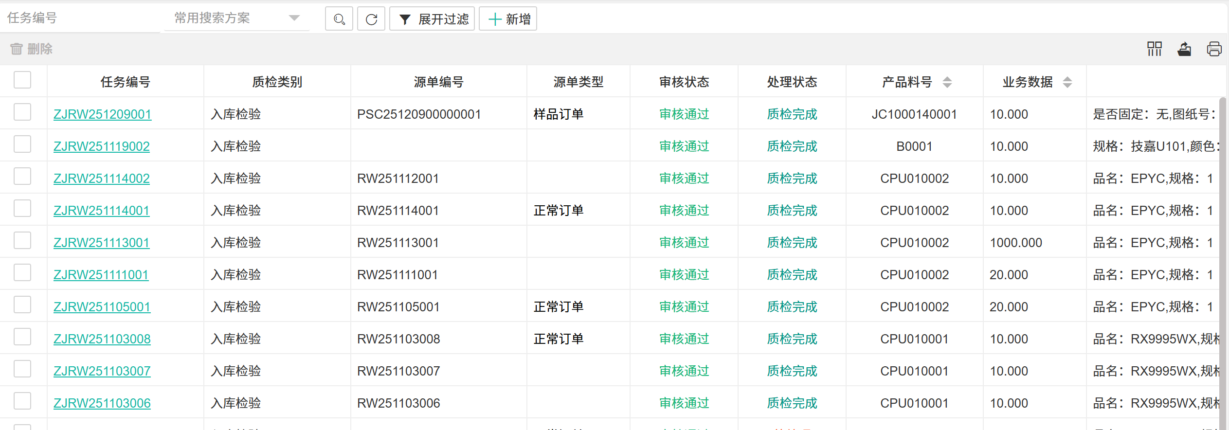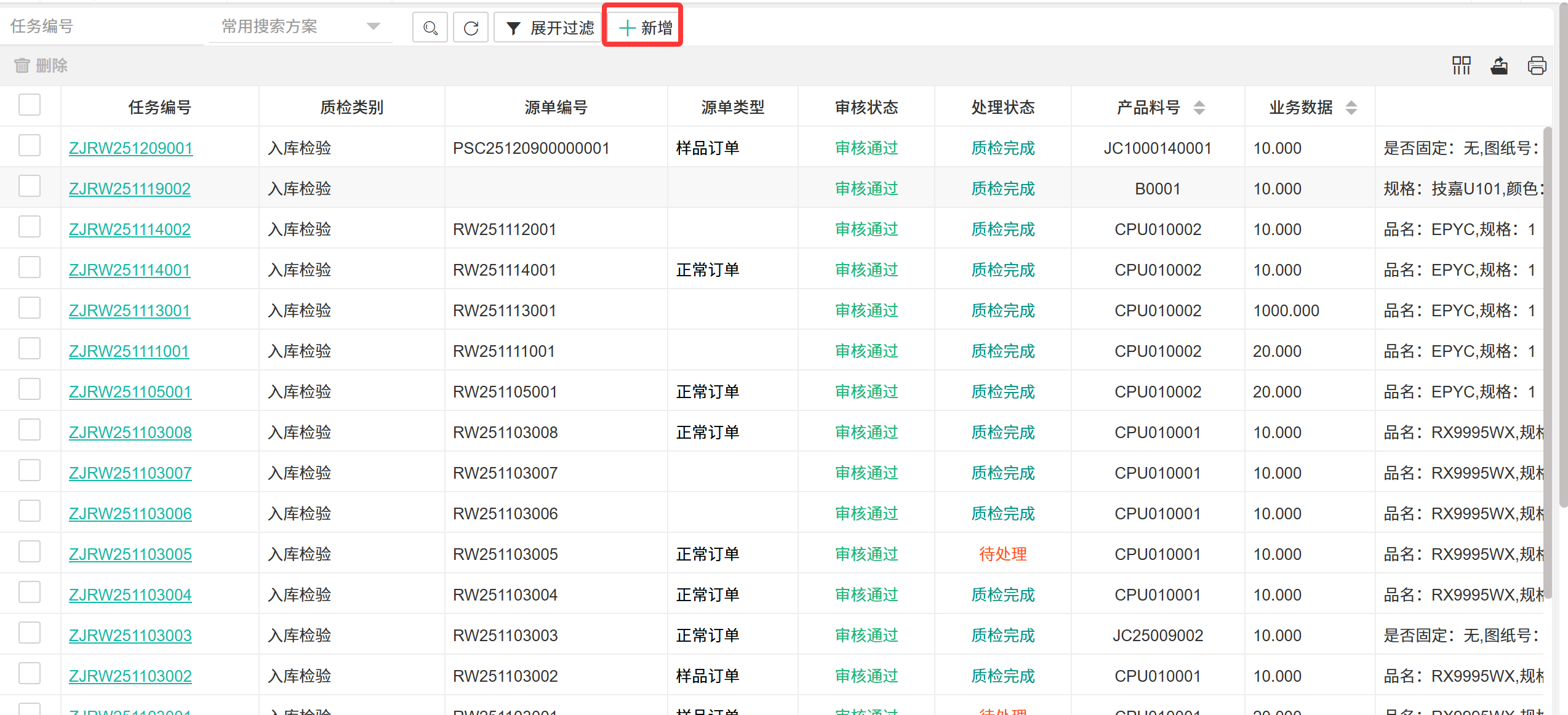 【入库质检检】物料或产品在入库前进行的质量检验。  ## ● 新增质检任务 操作步骤: 1. 进入【品质管理】>【制程IPQC】>【入库质检】。 2. 在搜索栏所在行单击【+新增】按钮,打开新增质检任务界面。 3. 填写信息后单击【提交】按钮。  > 入库质检字段说明 >| 字段 | 说明 | | --- | --- | |任务编号 |任务的唯一编号 | |质检类别 |检验的分类 | |源单编号 |触发检验的来源单据号 | |源单类型 |来源单据的类型 | |审核状态 |检验结果报告的审批状态 | |处理状态 |检验任务本身的进度 | |产品料号 |被检物料的唯一编码 | |业务数据 |与本次检验关联的扩展信息或参数 | |产品描述 |对产品的文字描述 | |品名 |通用名称 | |规格 |技术规格型号 | |颜色 |颜色属性 | |长度 |长度尺寸 | |宽度 |宽度尺寸 | |高度 |高度尺寸 | |图纸号 |设计图纸编号 | |是否固定 |指质检方案/标准是否固定不变 | |创建人 |发起检验任务的人员 | |创建时间 |任务创建的时间 | |质检完成时间 |检验实际完成的时间 | >d **附注** >1:用于记录入库前检验任务的完整主数据与状态,是质量追溯的起点。