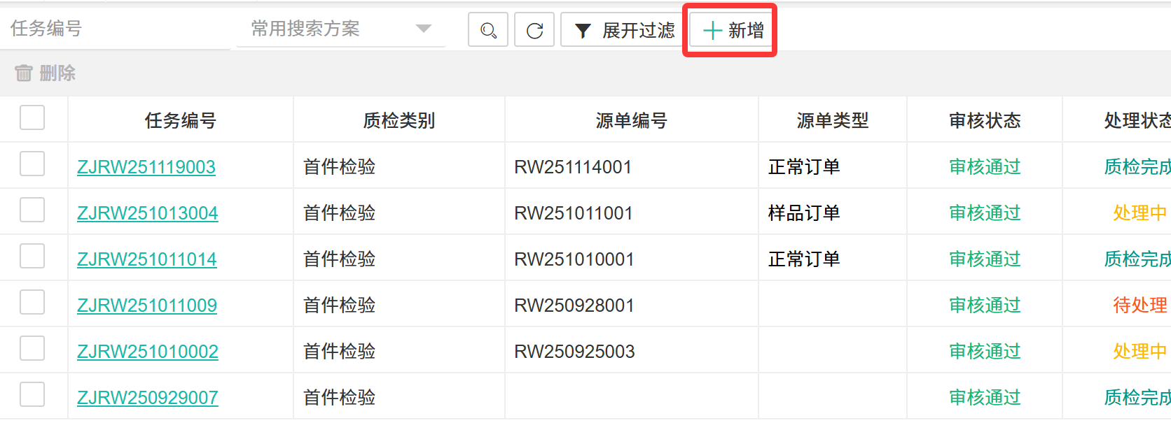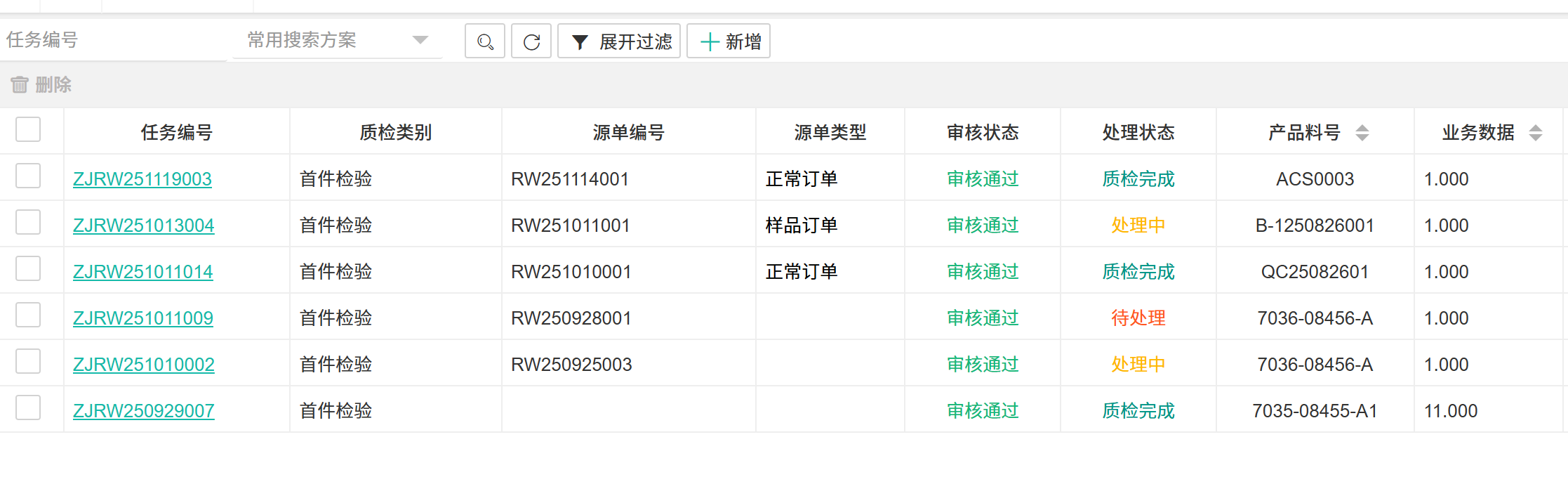 【首检质检】物料或产品在首次入库前进行的质量检验。  ## ● 新增质检任务 操作步骤: 1. 进入【品质管理】>【制程IQC】>【首件质检】。 2. 在搜索栏所在行单击【+新增】按钮,打开新增质检任务界面。 3. 填写信息后单击【提交】按钮。  > 首件质检字段说明 >| 字段 | 说明 | | --- | --- | |任务编号 |任务的唯一编号 | |质检类别 |检验的分类 | |源单编号 |触发检验的来源单据号 | |源单类型 |来源单据的类型 | |审核状态 |检验结果报告的审批状态 | |处理状态 |检验任务本身的进度 | |产品料号 |被检物料的唯一编码 | |业务数据 |与本次检验关联的扩展信息或参数 | |产品描述 |对产品的文字描述 | |品名 |通用名称 | |规格 |技术规格型号 | |颜色 |颜色属性 | |长度 |长度尺寸 | |宽度 |宽度尺寸 | |高度 |高度尺寸 | |图纸号 |设计图纸编号 | |是否固定 |指质检方案/标准是否固定不变 | |创建人 |发起检验任务的人员 | |创建时间 |任务创建的时间 | |质检完成时间 |检验实际完成的时间 | >d **附注** >1:用于记录入库前首次检验任务的完整主数据与状态,是质量追溯的起点。