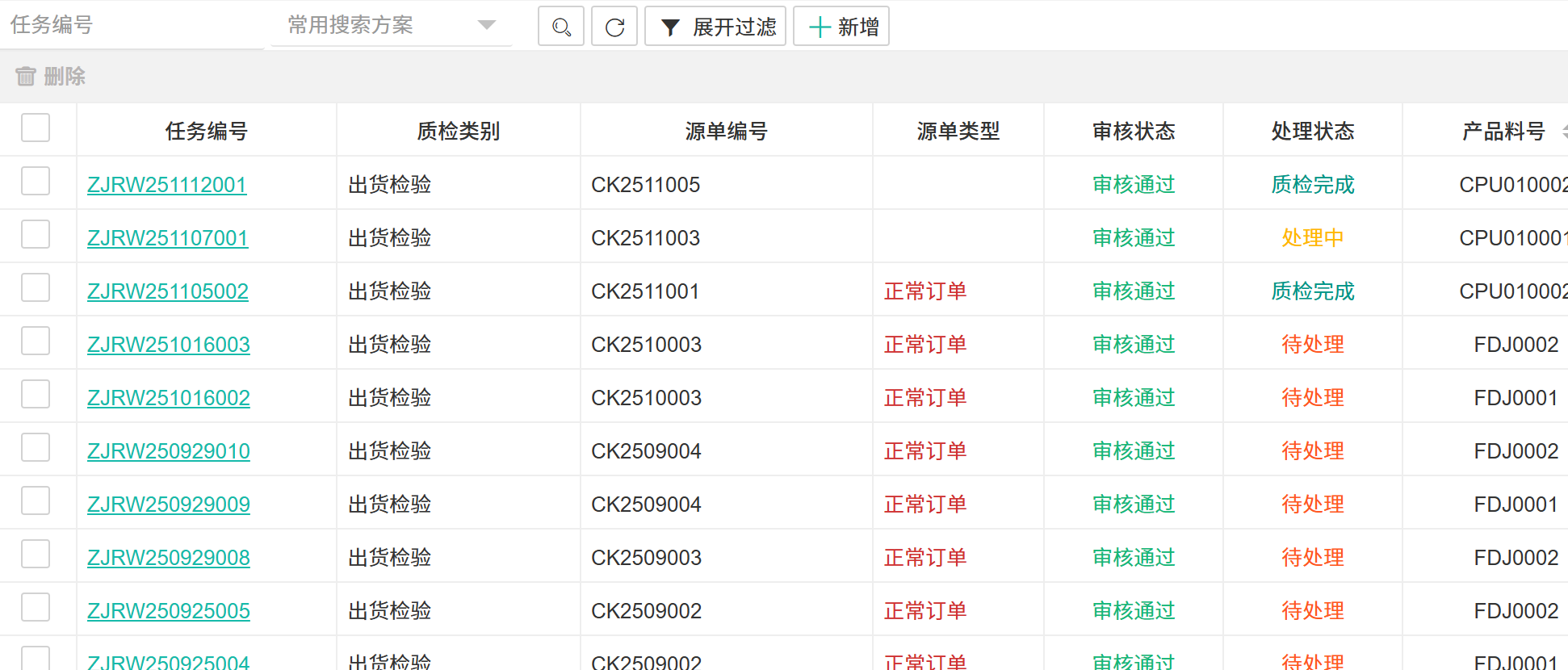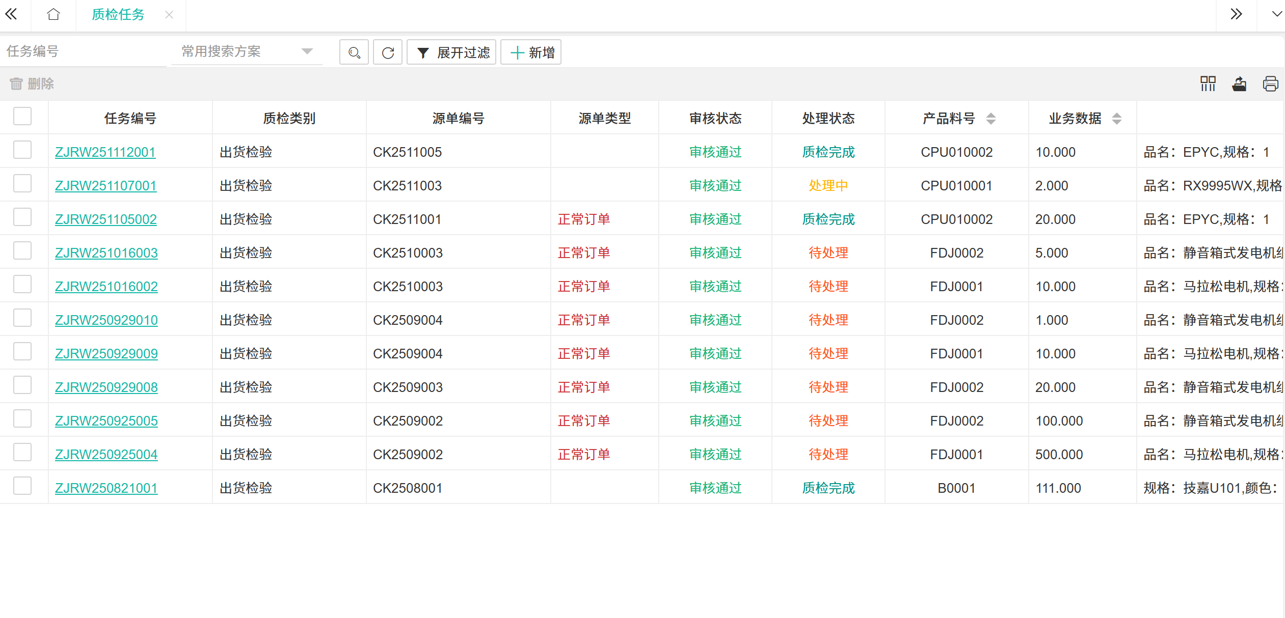 【质检任务】质量活动的核心记录。  ## ● 新增质检任务 操作步骤: 1. 进入【品质管理】>【出库检OQC】>【入库质检】。 2. 在搜索栏所在行单击【+新增】按钮,打开新增质检任务界面。 3. 填写信息后单击【提交】按钮。  > 质检任务字段说明 >| 字段 | 说明 | | --- | --- | |任务编号 |质检任务的唯一编号 | |质检类别 |检验的业务类型 | |源单编号 |触发质检的来源单据 | |源单类型 |来源单据的类型 | |审核状态 |质检结果报告的审批状态 | |处理状态 |质检任务的进度 | |产品料号 |被检物料的唯一编码 | |业务数据 |关联的业务扩展信息或参数 | |产品描述 |对物料的补充文字描述 | |品名 |物料的通用名称 | |规格 |技术规格型号 | |颜色 |颜色属性 | |长度 |长度尺寸 | |高度 |高度尺寸 | |宽度 |宽度尺寸 | |图纸号 |物料对应的设计图纸编号 | |是否固定 |指质检方案/标准是否固定不变 | |产品图片 |物件的参考图 | |创建人 |创建此质检任务的人员 | |创建时间 |质检任务生成的时间 | |质检完成时间 |检验实际完成的时间 | >d **附注** >1:包含了质检任务的主数据,是质量追溯的源头,驱动检验、判定及后续的库存、生产与财务流程。