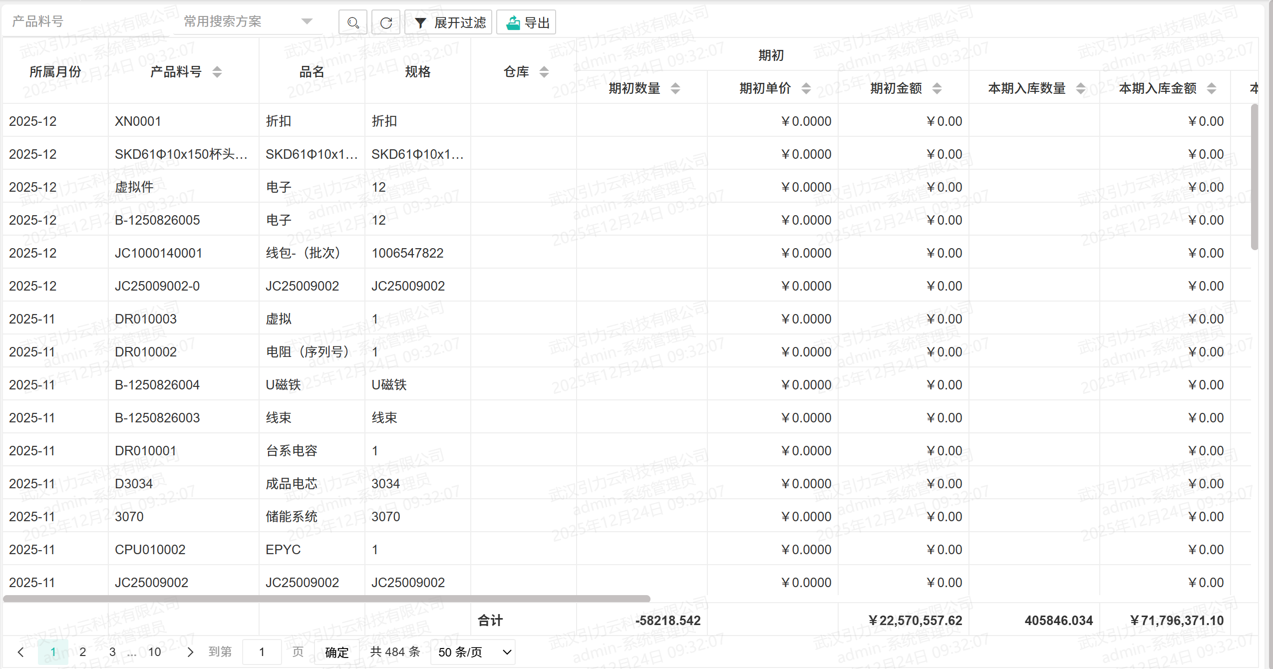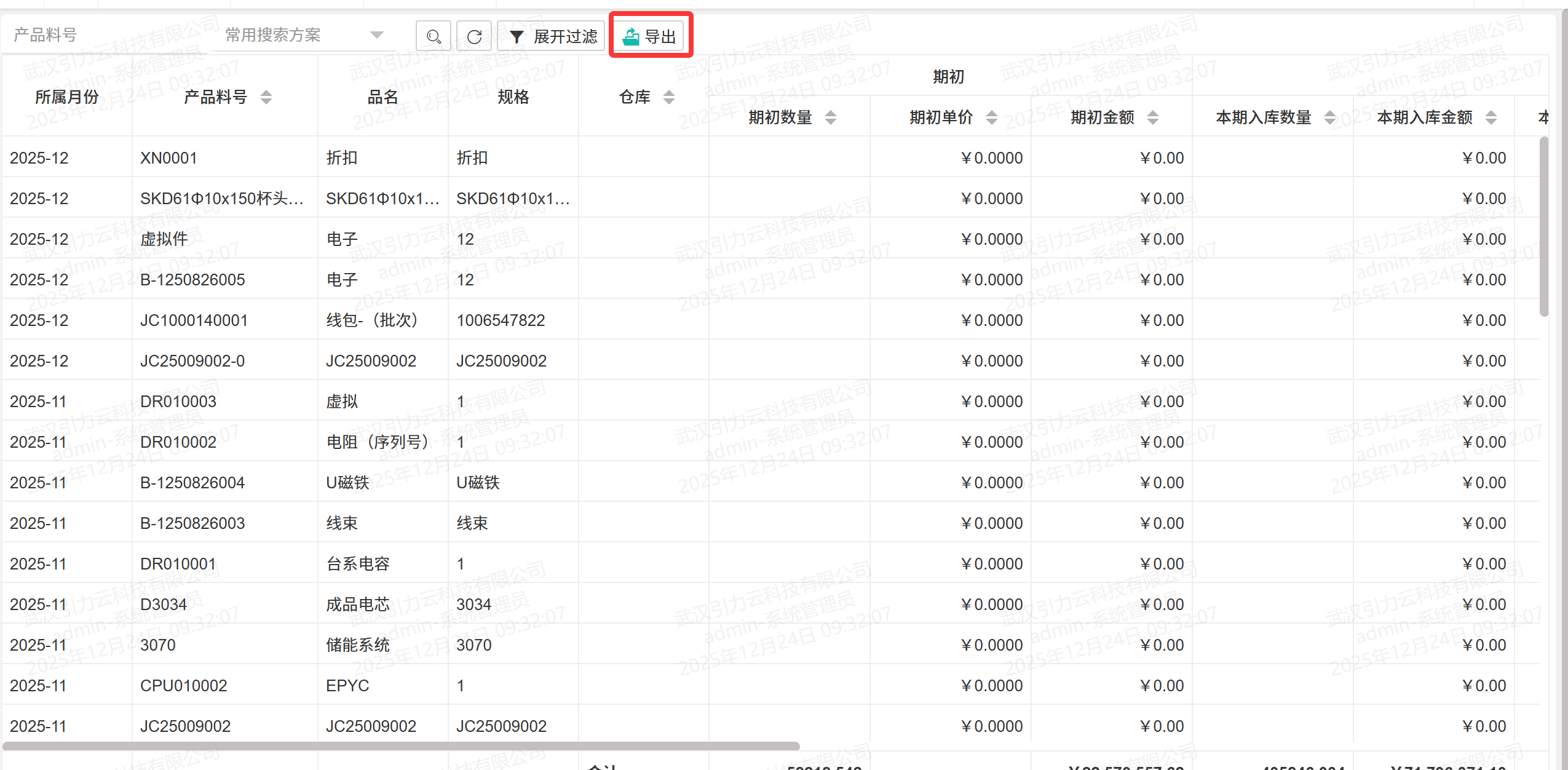 【库存余额】每一种物料/货品的实时结存数量、状态与价值的静态快照,是所有库存流动的最终结果体现。 ==报表勒缺少数据来源和计算的说明==  ## ● 库存余额导出 操作步骤: 1. 进入【仓库管理】>【仓库管理】>【库存余额】。 2. 单击【导出】按钮。