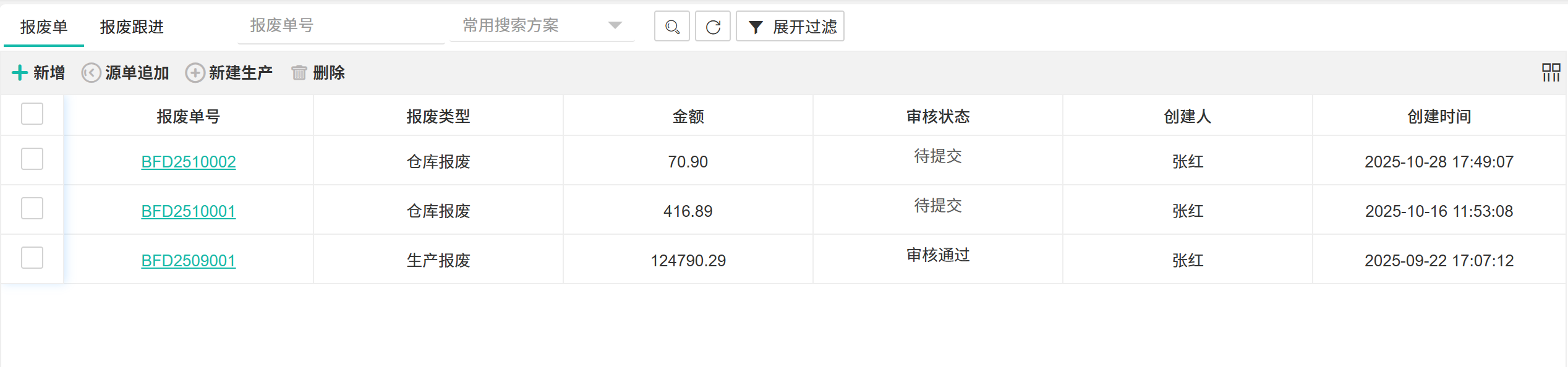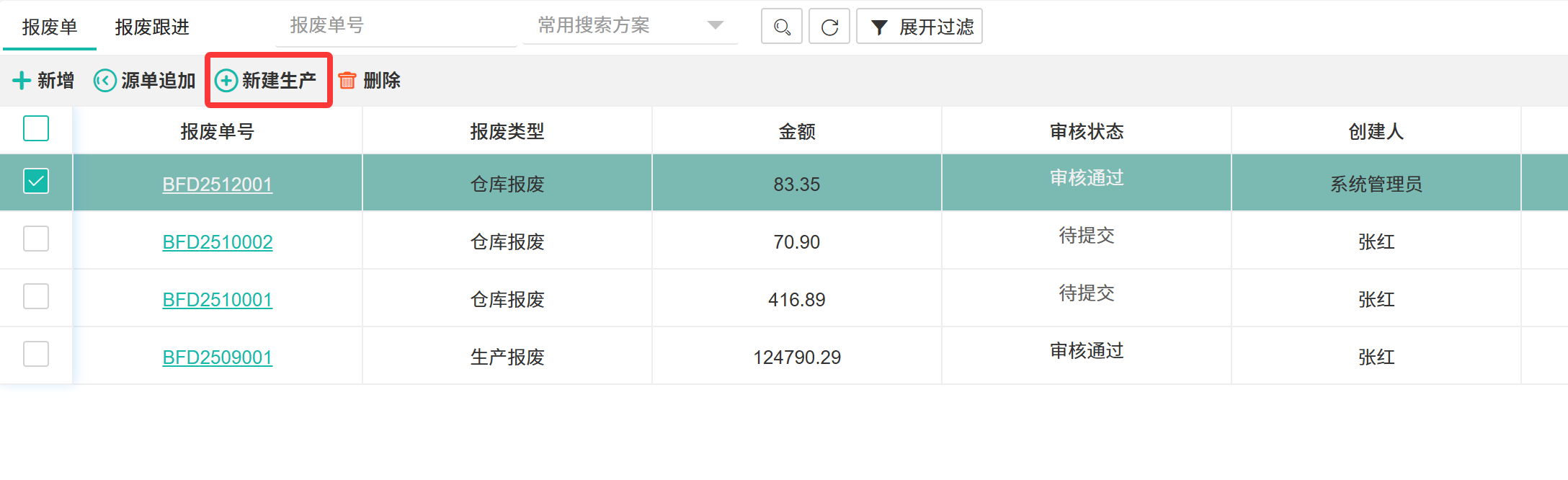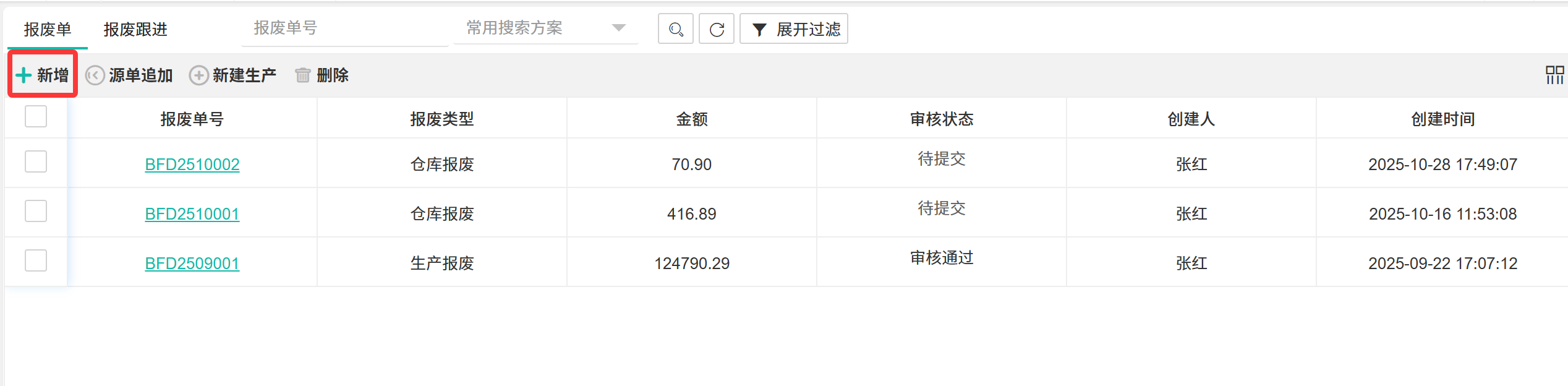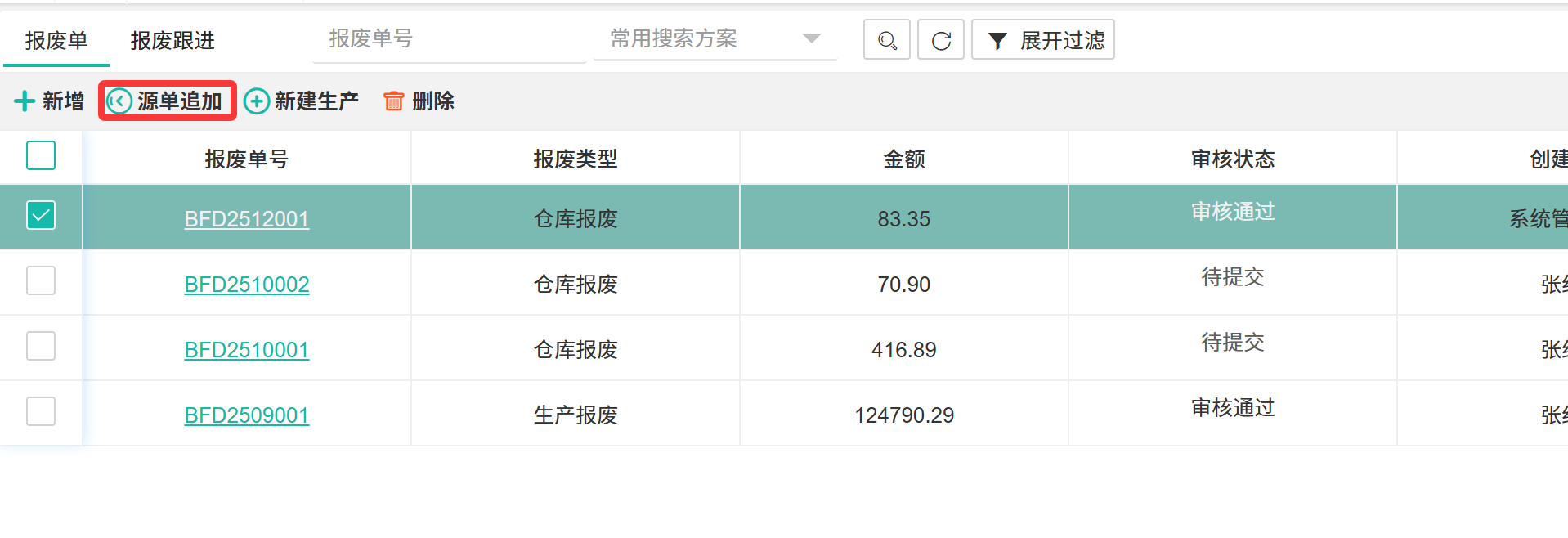 【报废文档】对仓库中的物料进行鉴定、处置与核销的标准化流程,旨在控制资产损失并追溯原因。  ## ● 报废单 ### ● 新增报废单 操作步骤: 1. 进入【仓库管理】>【仓库管理】>【报废管理】>【报废单】。 2. 单击【+新增】按钮,打开新增页面。 3. 填写信息后单击【保存】或【提交】。  ### ● 源单追加 操作步骤: 1. 进入【仓库管理】>【仓库管理】>【报废管理】>【报废单】。 2. 选中一条报废单,单击【源单追加】按钮。  >d **附注** >1:每次只能选择一条单据追加。 ### ● 新建生产 操作步骤: 1. 进入【仓库管理】>【仓库管理】>【报废管理】>【报废单】。 2. 选中一条报废单,单击【新建生产】按钮。  >d **附注** >1:每次只能选择一条单据新建生产。 ### ● 删除报废单 操作步骤: 1. 进入【仓库管理】>【仓库管理】>【报废管理】>【报废单】。 2. 选中一条报废单,单击【删除】按钮。  >d **附注** >1:每次只能选择一条单据删除。 ## ● 报废跟进 对报废单的审批、处置、核销等各环节进行任务分配、进度跟踪与结果闭环的监控流程。