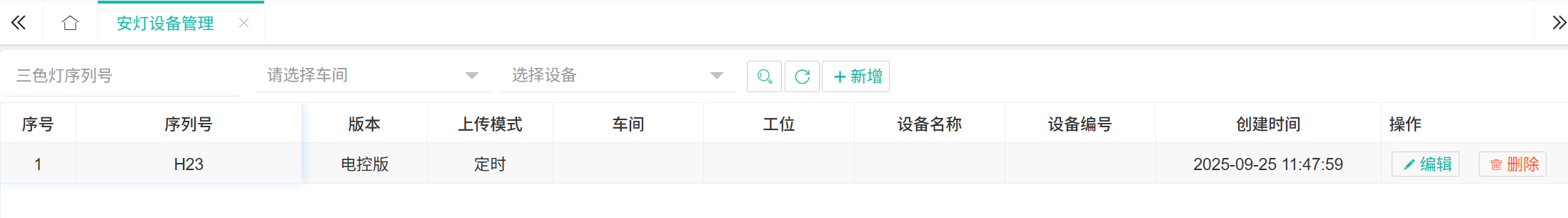 【安灯设备管理】记录安灯系统设备。  ## ● 新增设备 1. 进入【设备管理】>【安灯系统】>【安灯设备管理】; 2. 单击列表上方【+新增】,在弹出窗口填写完成后点击【确定】。 ## ● 编辑 在列表的操作栏单击【编辑】完成后【确定】。 ## ● 删除 在列表的操作栏单击【删除】完成后【确定】。