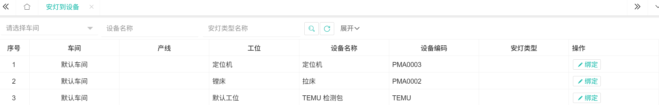 【安灯到设备】在设备上绑定具体的安灯类型。  ## ● 绑定 1. 进入【设备管理】>【安灯系统】>【安灯到设备】; 2. 选择要绑定的设备,在列表操作栏单击【绑定】; 3. 在弹出窗口点击【+增加一行】增加安灯请求类型; 4. 完成所有配置选项后,单击【保存】并【确定】。  ## ● 解绑 1. 选择要解绑的设备,在列表操作栏单击【绑定】; 2. 在弹出窗口选择要解绑的安灯请求类型,操作栏单击【⨂】并【确定】; 3. 删除后点击【保存】。